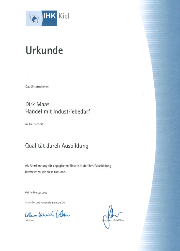 Für unser Engagement in der Berufsausbildung wurden wir von der Industrie- und Handelskammer zu Kiel ausgezeichnet.